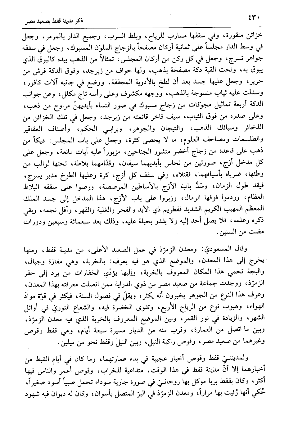 ولمدينتي قفط وقوص أخبار عجيبة في بدء عمارتهما، وما كان في أيام القبط من أخبارهما إلا أنّ مدينة قفط في هذا الوقت، متداعية للخراب، وقوص أعمر والناس فيها أكثر، وكان بقفط بربا موكل بها روحانيّ في صورة جارية سوداء تحمل صبيا أسود صغيرا، حكي أنها رئيت بها مرارا، ومعدن الزمرّذ في البرّ المتصل بأسوان، وكان له ديوان فيه شهود