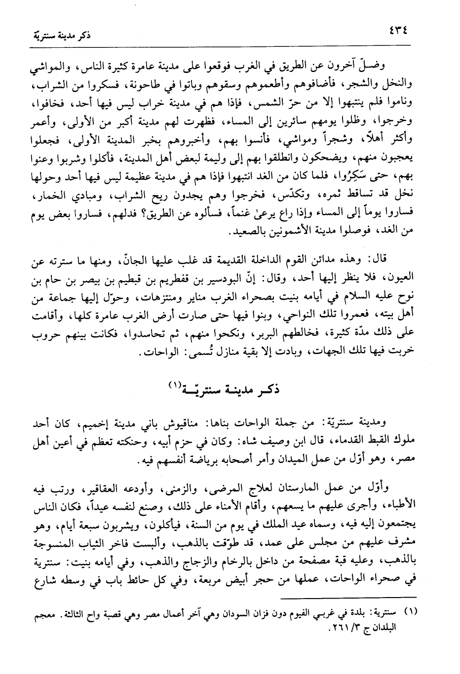 قال: وهذه مدائن القوم الداخلة القديمة قد غلب عليها الجانّ، ومنها ما سترته عن العيون، فلا ينظر إليها أحد، وقال: إنّ البودسير بن قفطريم بن قبطيم بن بيصر بن حام بن نوح عليه السلام في أيامه بنيت بصحراء الغرب مناير ومنتزهات، وحوّل إليها جماعة من أهل بيته، فعمروا تلك النواحي، وبنوا فيها حتى صارت أرض الغرب عامرة كلها، وأقامت على ذلك مدّة كثيرة، فخالطهم البربر، ونكحوا منهم، ثم تحاسدوا، فكانت بينهم حروب خربت فيها تلك الجهات، وبادت إلا بقية منازل تسمى: الواحات.