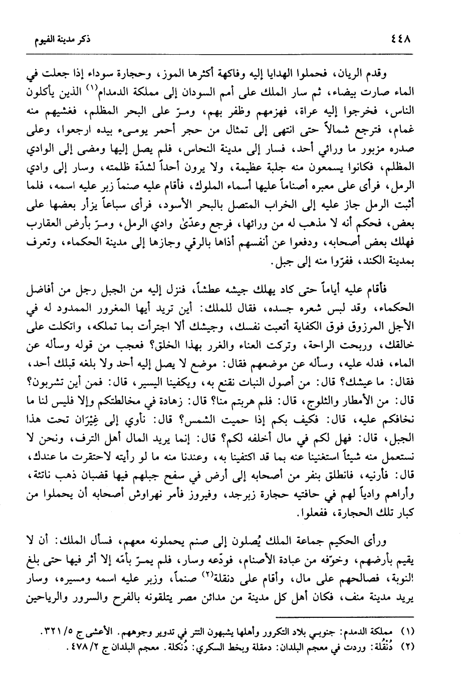 ورأى الحكيم جماعة الملك يصلون إلى صنم يحملونه معهم، فسأل الملك: أن لا يقيم بأرضهم، وخوّفه من عبادة الأصنام، فودّعه وسار، فلم يمرّ بأمّه إلا أثر فيها حتى بلغ النوبة، فصالحهم على مال، وأقام على دنقلة «2» صنما، وزبر عليه اسمه ومسيره، وسار يريد مدينة منف، فكان أهل كل مدينة من مدائن مصر يتلقونه بالفرح والسرور والرياحين