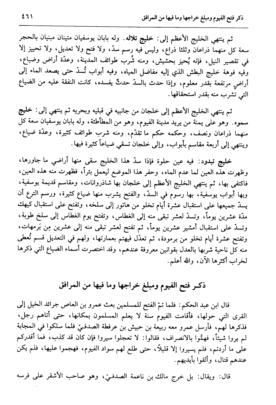 ذكر فتح الفيوم ومبلغ خراجها وما فيها من المرافق