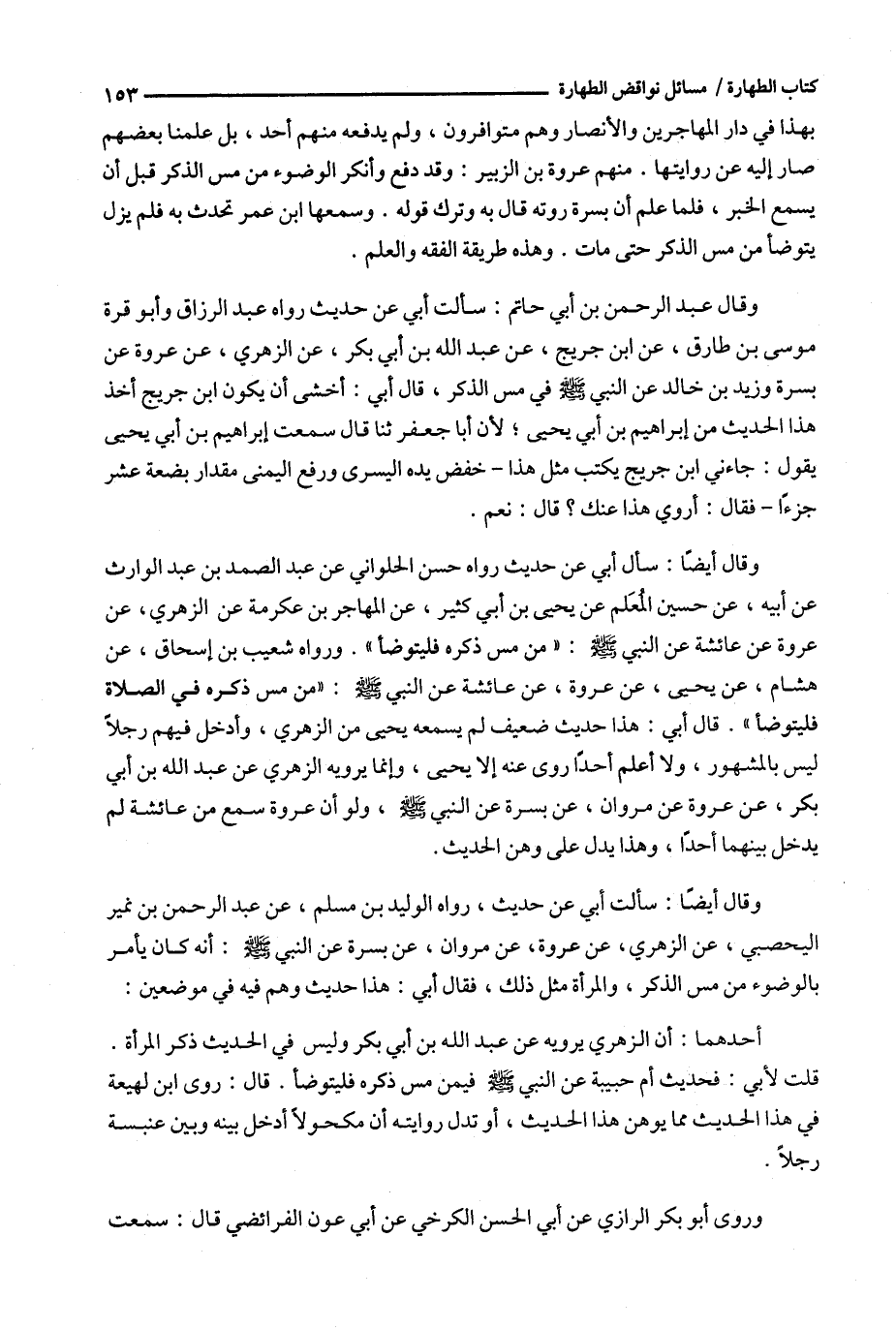 وقال أيضا : سألت أبي عن حديث ، رواه الوليد بن مسلم ، عن عبد الرحمن بن نمير اليحصبي ، عن الزهري ، عن عروة ، عن مروان ، عن بسرة عن النبي : أنه كان يأمر بالوضوء من مس الذكر ، والمرأة مثل ذلك ، فقال أبي : هذا حديث وهم فيه في موضعين :