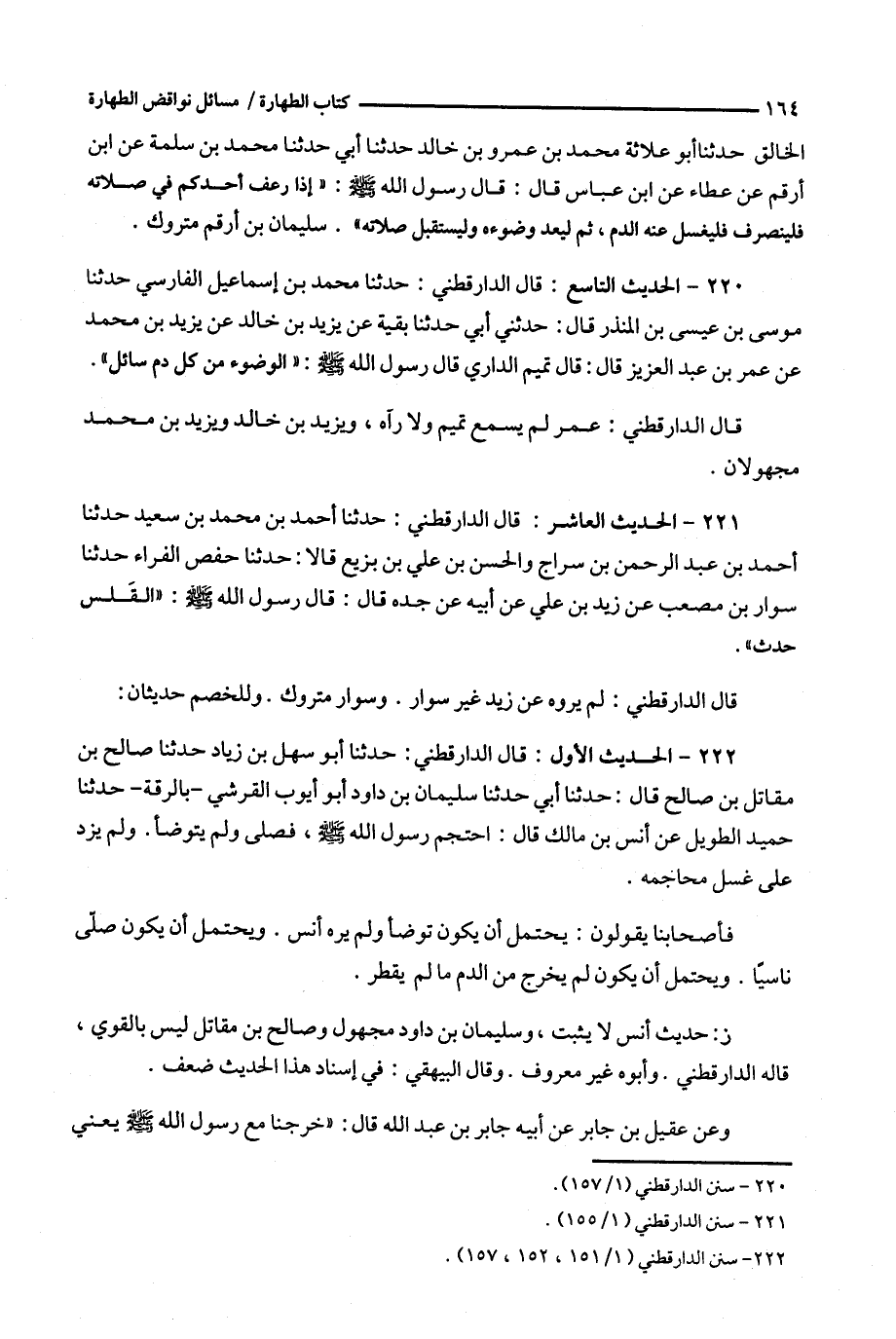 220 - الحديث التاسع : قال الدارقطني : حدثنا محمد بن إسماعيل الفارسي حدثنا موسى بن عيسى بن المنذر قال : حدثني أبي حدثنا بقية عن يزيد بن خالد عن يزيد بن محمد عن عمر بن عبد العزيز قال : قال تميم الداري قال رسول الله : ' الوضوء من كل دم سائل ' .
