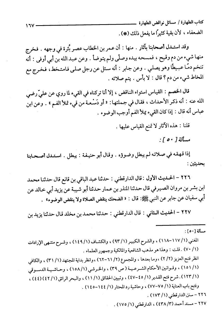 قال الخصم : القياس استواء الناقض ، إلا أنا تركناه في القيء لما روي عن علي رضي الله عنه : أنه ذكر الأحداث ، فقال في جملتها ك ' أو دسعة من قيء تملأ الفم ' .