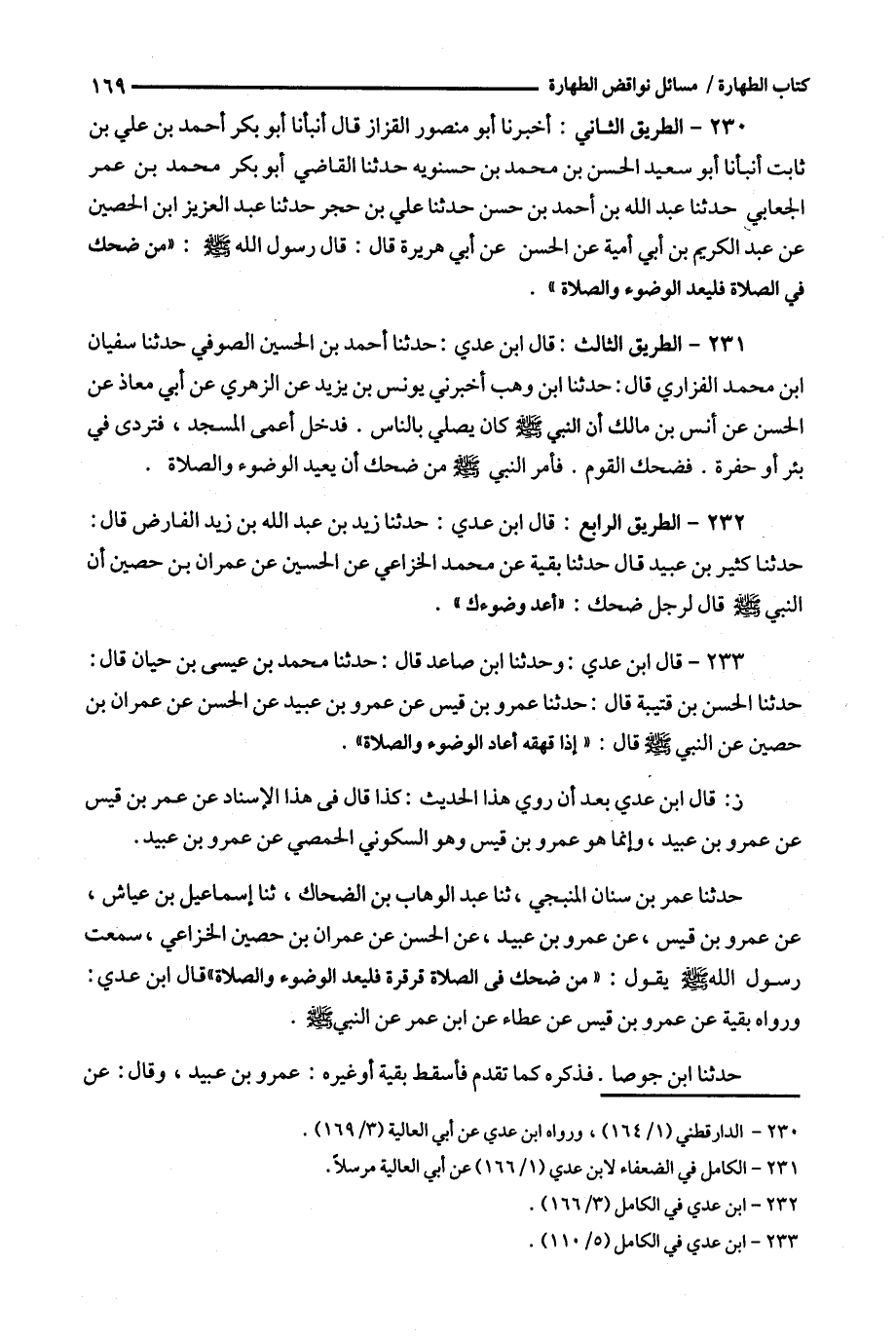 232 - الطريق الرابع : قال ابن عدي : حدثنا زيد بن عبد الله بن زيد الفارض قال : حدثنا كثير بن عبيد قال حدثنا بقية عن محمد الخزاعي عن الحسين عن عمران بن حصين أن النبي قال لرجل ضحك : ' أعد وضوءك ' .
