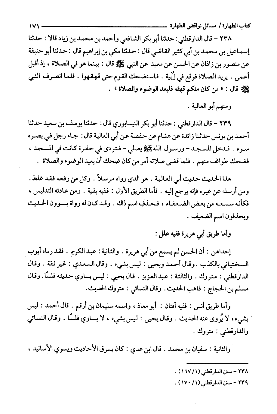 239 - قال الدارقطني : حدثنا أبو بكر النيسابوري قال : حدثنا يوسف بن سعيد حدثنا أحمد بن يونس حدثنا زائدة عن هشام عن حفصة عن أبي العالية قال : جاء رجل في بصره سوء .