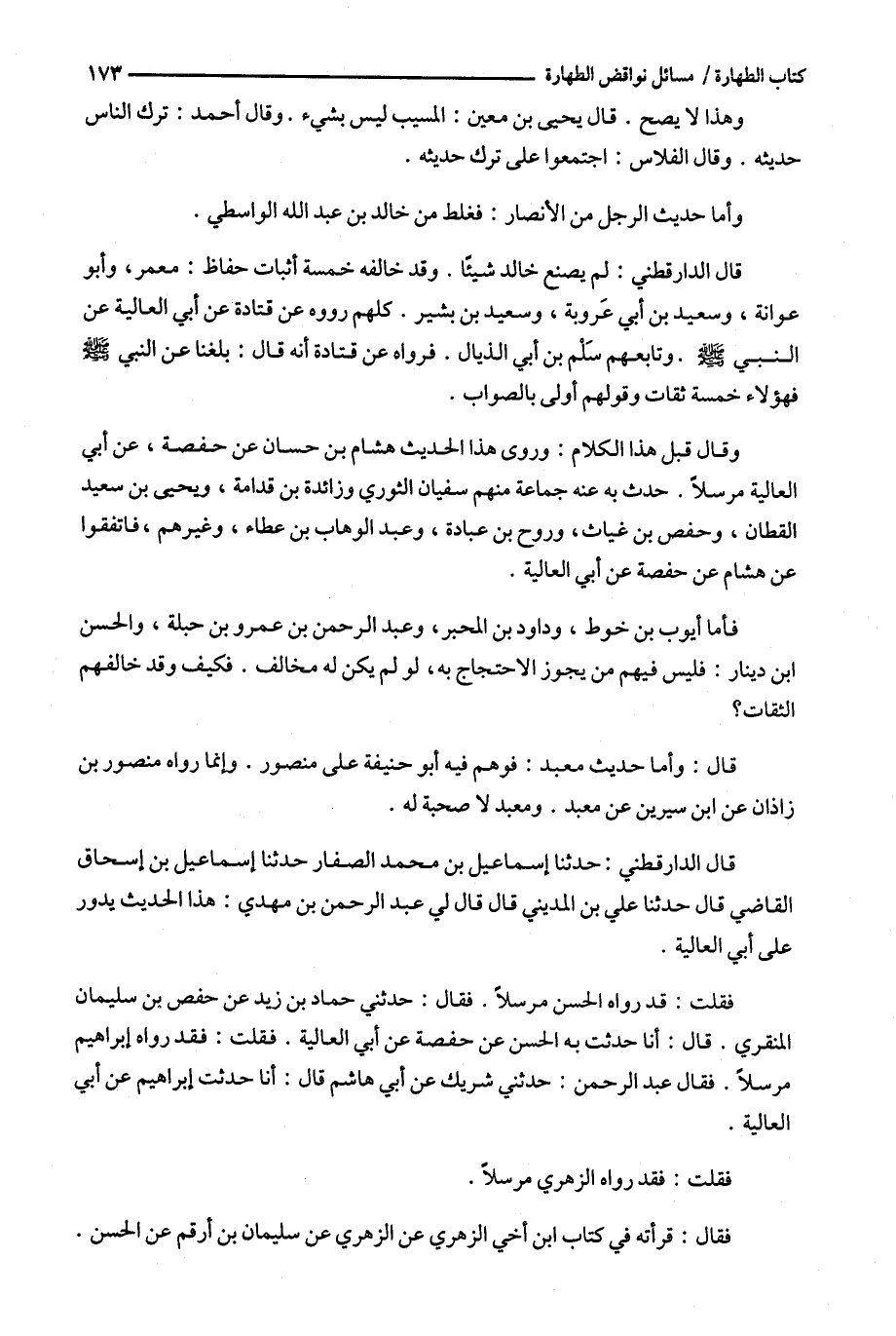 قال الدارقطني : حدثنا إسماعيل بن محمد الصفار حدثنا إسماعيل بن إسحاق القاضي قال حدثنا علي بن المديني قال قال لي عبد الرحمن بن مهدي : هذا الحديث يدور على أبي العالية .