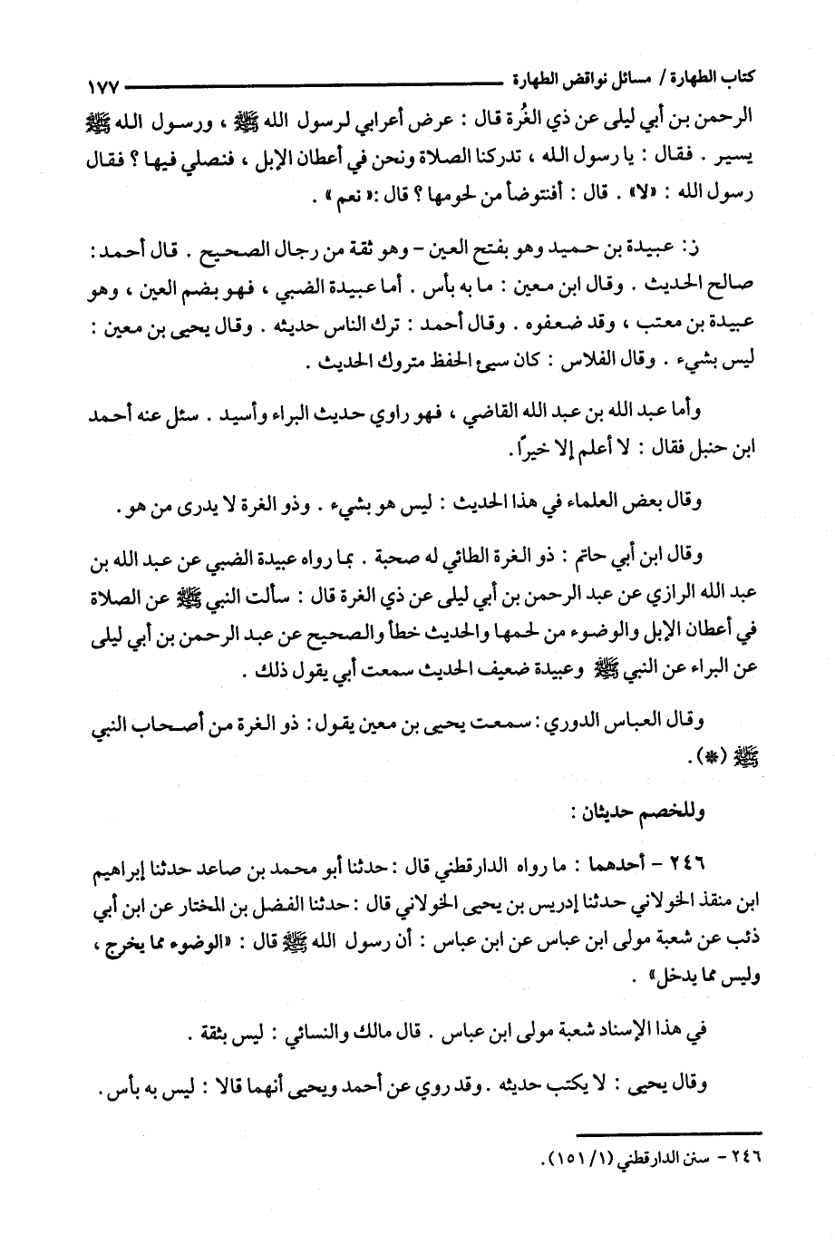 بما رواه عبيدة الضبي عن عبد الله بن عبد الله الرازي عن عبد الرحمن بن أبي ليلى عن ذي الغرة قال : سألت النبي عن الصلاة في أعطان الإبل والوضوء من لحمها والحديث خطأ والصحيح عن عبد الرحمن بن أبي ليلى عن البراء عن النبي وعبيدة ضعيف الحديث سمعت أبي يقول ذلك .