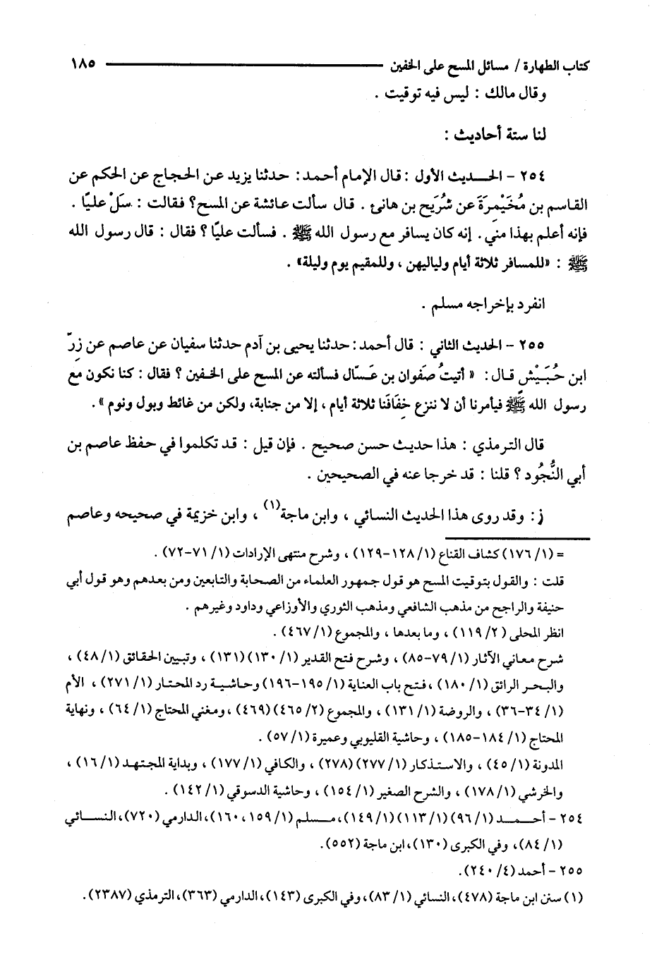 255 - الحديث الثاني : قال أحمد : حدثنا يحيى بن آدم حدثنا سفيان عن عاصم عن زر ابن حبيش قال : ' أتيت صفوان بن عسال فسألته عن المسح على الخفين ؟ فقال : كنا نكون مع رسول الله فيأمرنا أن لا ننزع خفافنا ثلاثة أيام ، إلا من جنابة ، ولكن من غائط وبول ونوم ' .