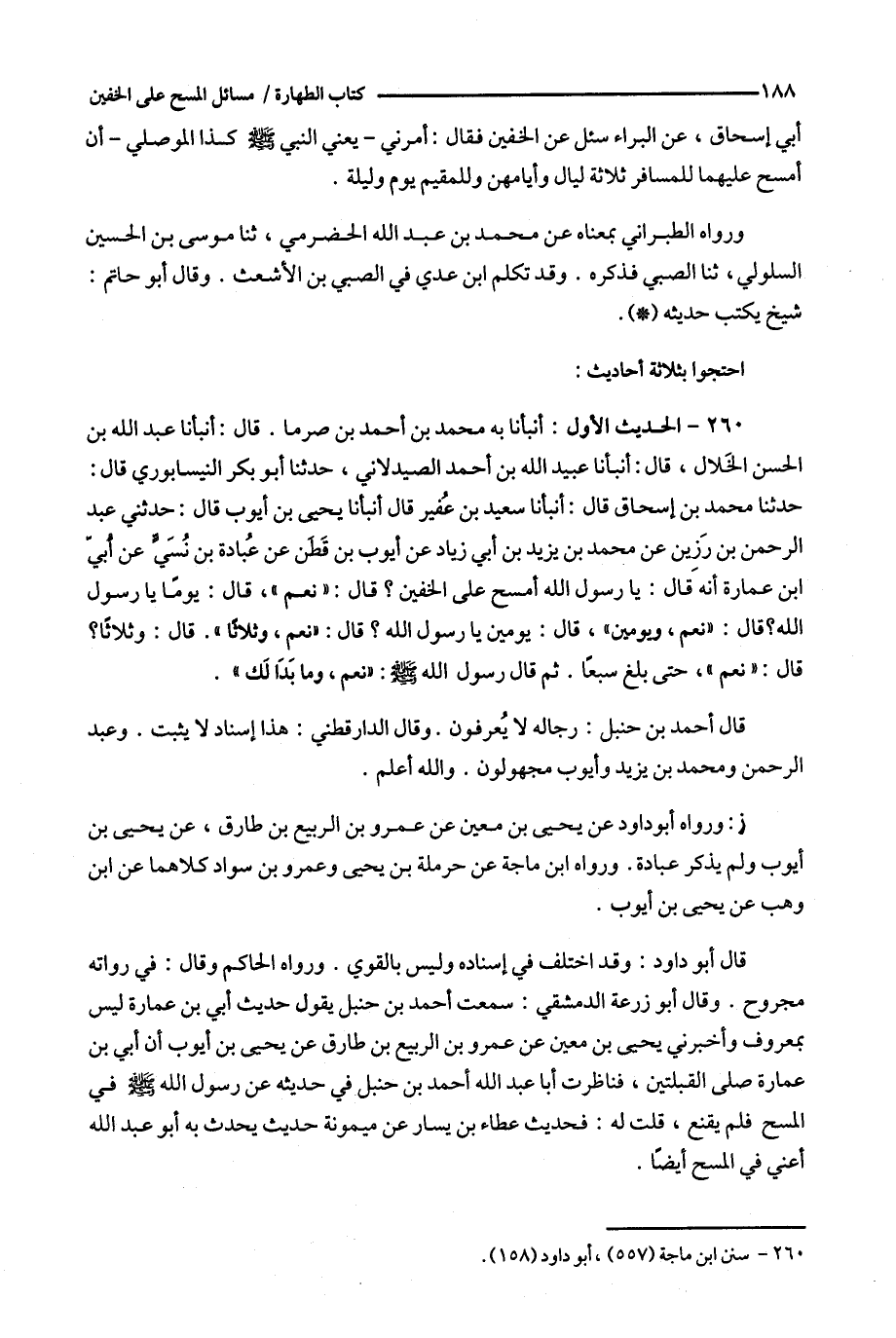 قال : أنبأنا عبد الله بن الحسن الخلال ، قال : أنبأنا عبيد الله بن أحمد الصيدلاني ، حدثنا أبو بكر النيسابوري قال : حدثنا محمد بن إسحاق قال : أنبأنا سعيد بن عفير قال أنبأنا يحيى بن أيوب قال : حدثني عبد الرحمن بن رزين عن محمد بن يزيد بن أبي زياد عن أيوب بن قطن عن عبادة بن نسي عن أبي ابن عمارة أنه قال : يا رسول الله أمسح على الخفين ؟ قال : ' نعم ' ، قال : يوما يا رسول الله ؟ قال : ' نعم ، ويومين ' ، قال : يومين يا رسول الله ؟ قال : نعم ، وثلاثا ' .