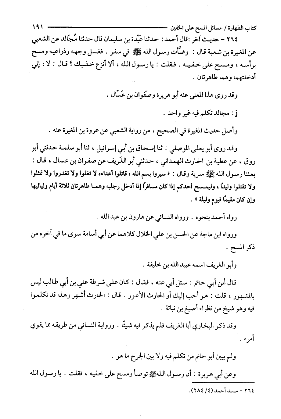 246 - حديث آخر : قال أحمد : حدثنا عبدة بن سليمان قال حدثنا مجالد عن الشعبي عن المغيرة بن شعبة قال : وضأت رسول الله في سفر .