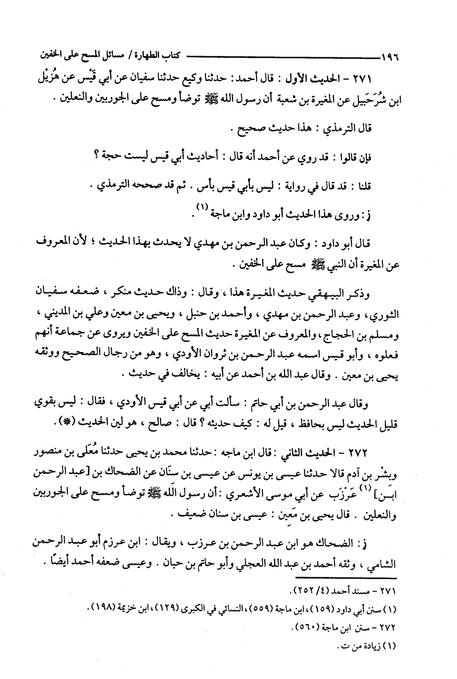 272 - الحديث الثاني : قال ابن ماجه : حدثنا محمد بن يحيى حدثنا معلى بن منصور وبشر بن آدم قالا حدثنا عيسى بن يونس عن عيسى بن سنان عن الضحاك بن [ عبد الرحمن ابن ] ( 1 ) عرزب عن أبي موسى الأشعري : أن رسول الله توضأ ومسح على الجوربين والنعلين .