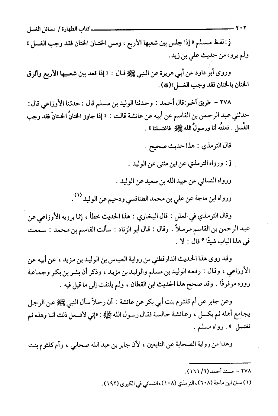 278 - طريق آخر : قال أحمد : وحدثنا الوليد بن مسلم قال : حدثنا الأوزاعي قال : حدثني عبد الرحمن بن القاسم عن أبيه عن عائشة قالت : ' إذا جاوز الختان الختان فقد وجب الغسل .
