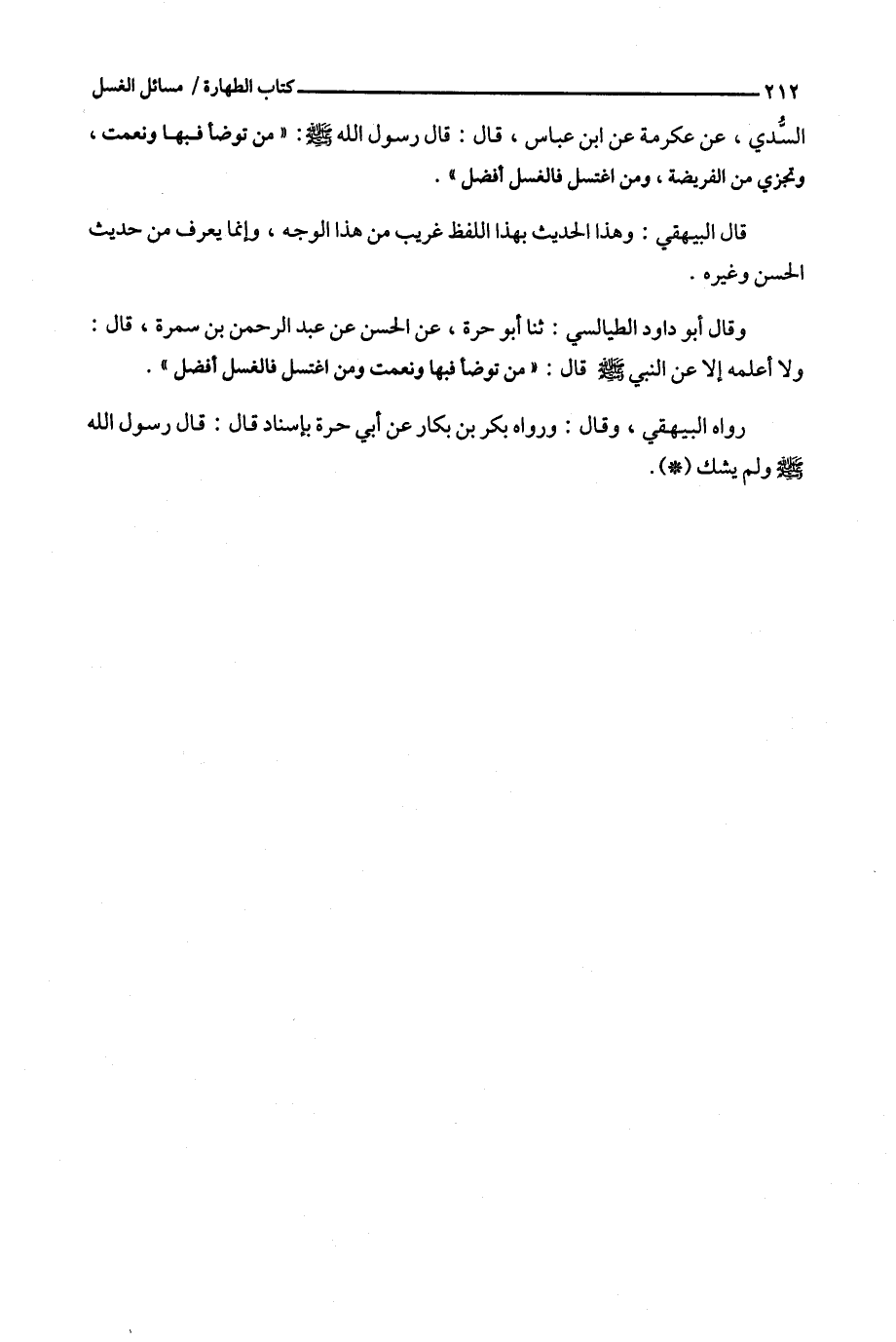 وقال أبو داود الطيالسي : ثنا أبو حرة ، عن الحسن عن عبد الرحمن بن سمرة ، قال : ولا أعلمه إلا عن النبي قال : ' من توضأ فبها ونعمت ومن اغتسل فالغسل أفضل ' .