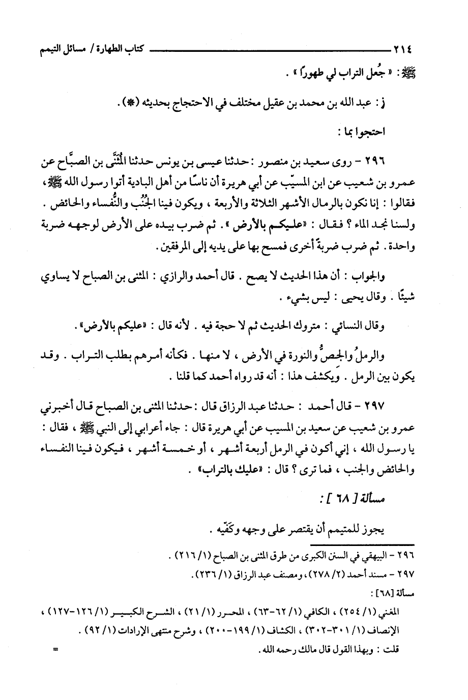 297 - قال أحمد : حدثنا عبد الرزاق قال : حدثنا المثنى بن الصباح قال أخبرني عمرو بن شعيب عن سعيد بن المسيب عن أبي هريرة قال : جاء أعرابي إلى النبي ، فقال : يا رسول الله ، إني أكون في الرمل أربعة أشهر ، أو خمسة أشهر ، فيكون فينا النفساء والحائض والجنب ، فما ترى ؟ قال : ' عليك بالتراب ' . مسألة [ 68 ] :