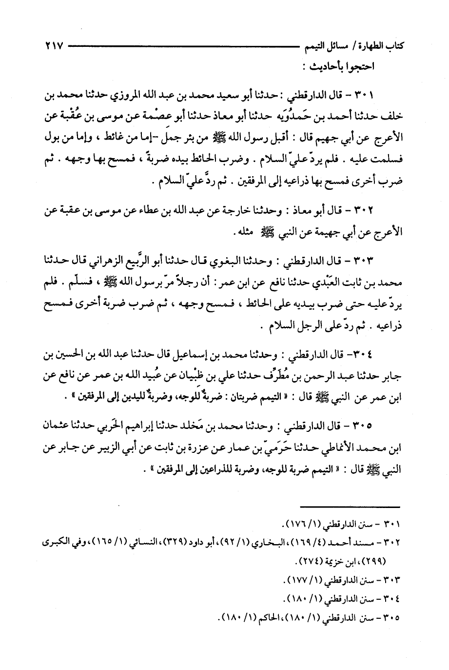 305 - قال الدارقطني : وحدثنا محمد بن مخلد حدثنا إبراهيم الحربي حدثنا عثمان ابن محمد الأنماطي حدثنا حرمي بن عمار عن عزرة بن ثابت عن أبي الزبير عن جابر عن النبي قال : ' التيمم ضربة للوجه ، وضربة للذراعين إلى المرفقين ' .