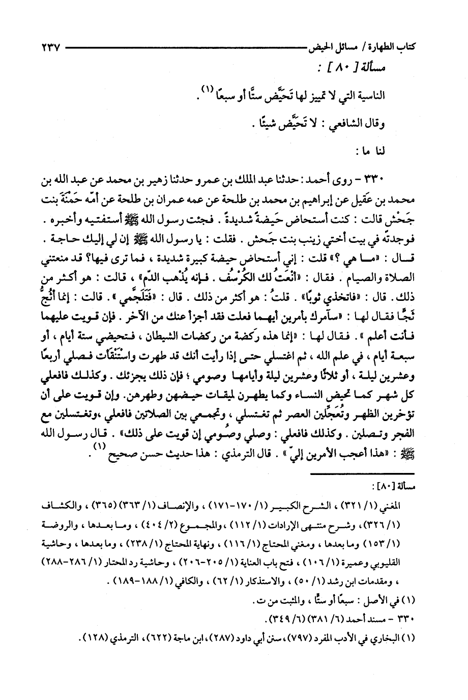 330 - روى أحمد : حدثنا عبد الملك بن عمرو حدثنا زهير بن محمد عن عبد الله بن محمد بن عقيل عن إبراهيم بن محمد بن طلحة عن عمه عمران بن طلحة عن أمه حمنة بنت جحش قالت : كنت أستحاض حيضة شديدة .