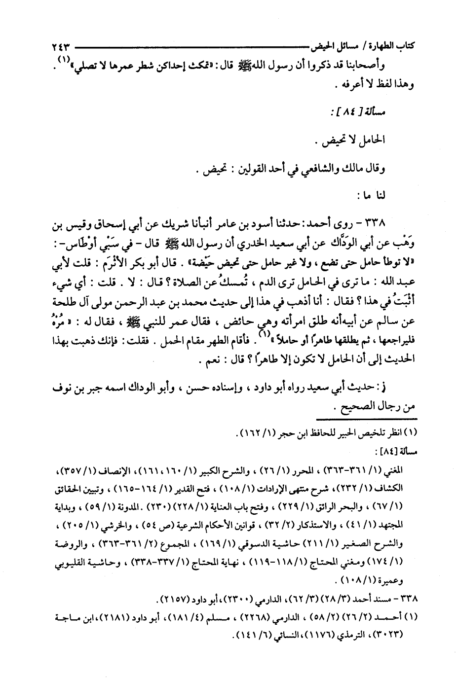 338 - روى أحمد حدثنا أسود بن عامر أنبأنا شريك عن أبي إسحاق وقيس بن وهب عن أبي الوداك عن أبي سعيد الخدري أن رسول الله قال - في سبي أوطاس - : ' لا توطأ حامل حتى تضع ، ولا غير حامل حتى تحيض حيضة ' .