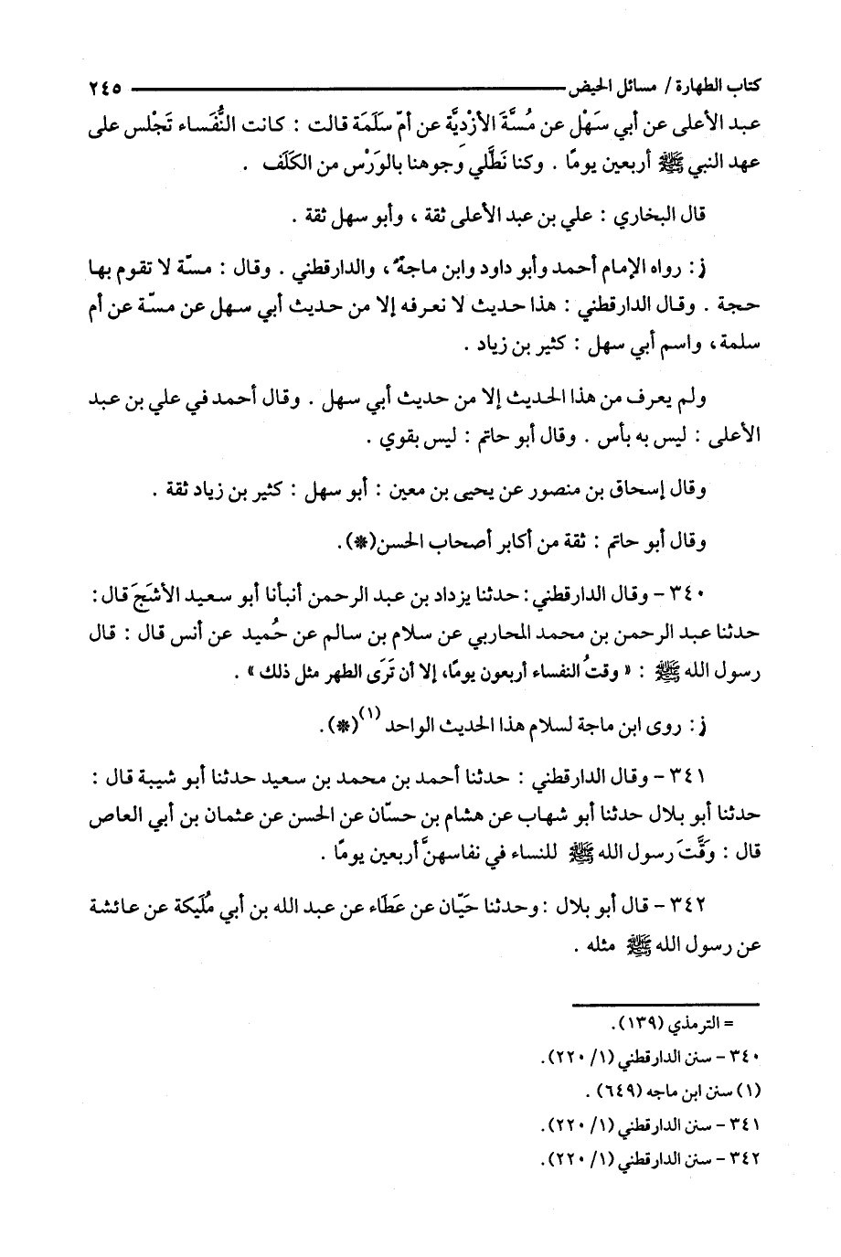 340 - وقال الدارقطني : حدثنا يزداد بن عبد الرحمن أنبأنا أبو سعيد الأشج قال : حدثنا عبد الرحمن بن محمد المحاربي عن سلام بن سالم عن حميد عن أنس قال : قال رسول الله : ' وقت النفساء أربعون يوما ، إلا أن ترى الطهر مثل ذلك ' .
