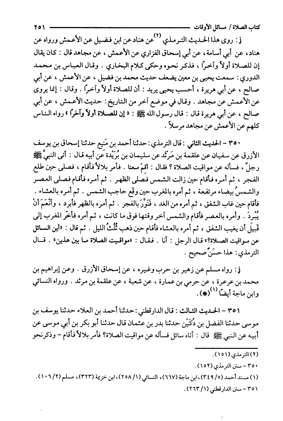 351 - الحديث الثالث : قال الدارقطني : حدثنا أحمد بن العلاء حدثنا يوسف بن موسى حدثنا الفضل بن دكين حدثنا بدر بن عثمان قال حدثنا أبو بكر بن أبي موسى عن أبيه عن النبي قال : أتاه سائل فسأله عن مواقيت الصلاة ؟ فأمر بلالا فأقام - وذكر نحو
