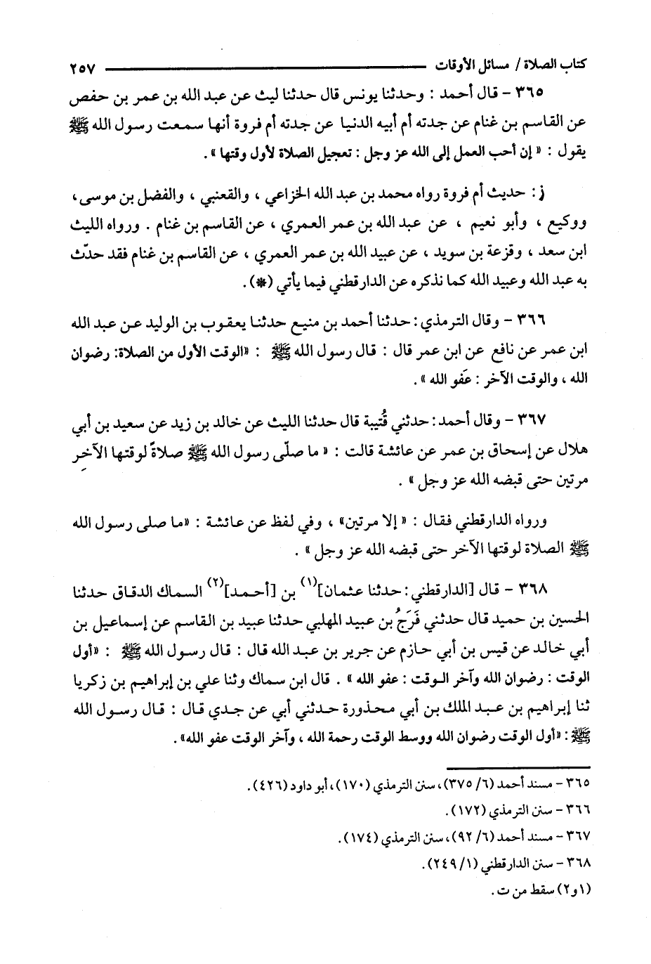 368 - قال [ الدارقطني : حدثنا عثمان ] ( 1 ) بن [ أحمد ] ( 2 ) السماك الدقاق حدثنا الحسين بن حميد قال حدثني فرج ابن عبيد المهلبي حدثنا عبيد ابن القاسم عن إسماعيل بن أبي خالد عن قيس بن أبي حازم عن جرير بن عبد الله قال : قال رسول الله : ' أول الوقت : رضوان الله وآخر الوقت : عفو الله ' .