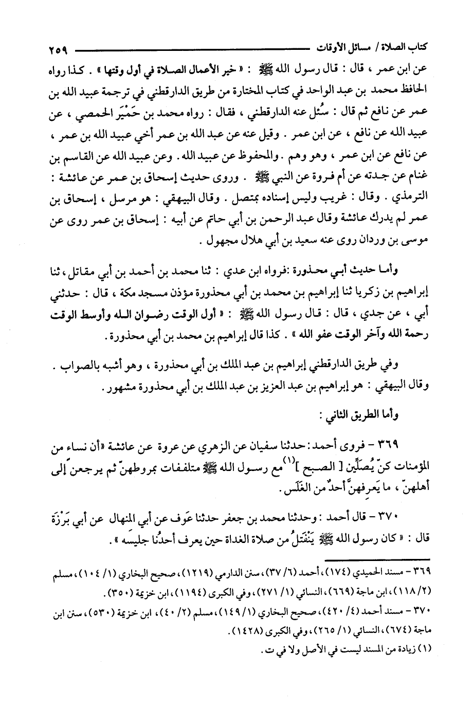 369 - فروى أحمد : حدثنا سفيان عن الزهري عن عروة عن عائشة ' أن نساء من المؤمنات كن يصلين [ الصبح ] ( 1 ) مع رسول الله متلففات بمروطهن ثم يرجعن إلى أهلهن ، ما يعرفهن أحد من الغلس ' .