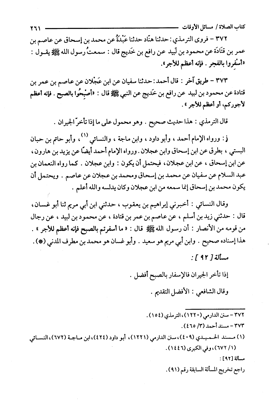 372 - فروى الترمذي : حدثنا هناد حدثنا عبدة عن محمد بن إسحاق عن عاصم بن عمر بن قتادة عن محمود بن لبيد عن رافع بن خديج قال : سمعت رسول الله يقول : ' أسفروا بالفجر . فأنه أعظم للأجر ' .