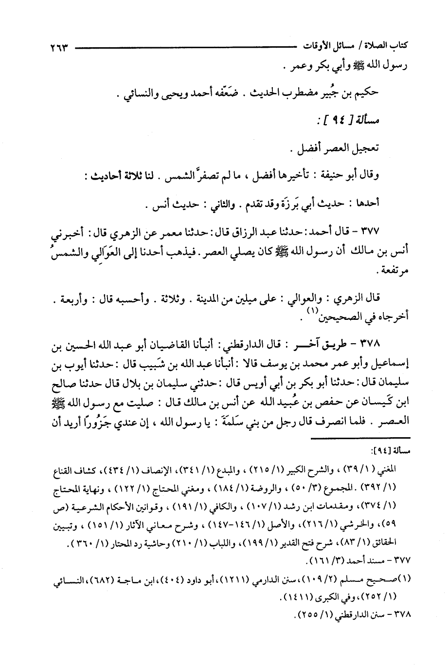 378 - طريق آخر : قال الدارقطني : أنبأنا القاضيان أبو عبد الله الحسين بن إسماعيل وأبو عمر محمد بن يوسف قالا : أنبأنا عبد الله بن شبيب قال : حدثنا أيوب بن سليمان قال : حدثنا أبو بكر بن أبي أويس قال : حدثني سليمان بن بلال قال حدثنا صالح ابن كيسان عن حفص بن عبيد الله عن أنس بن مالك قال : صليت مع رسول الله العصر .