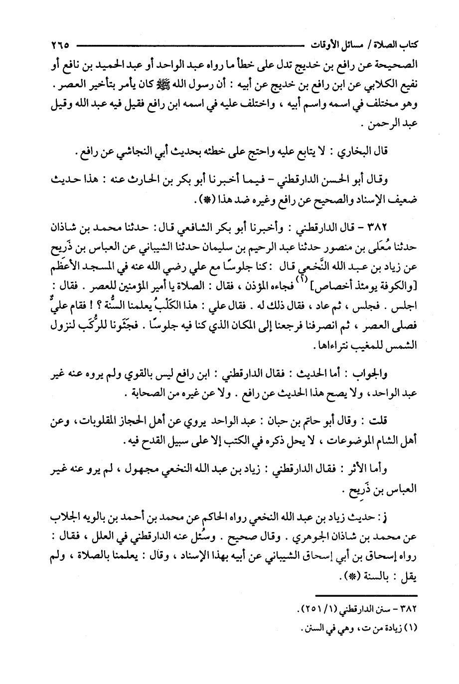 382 - قال الدارقطني : وأخبرنا أبو بكر الشافعي قال : حدثنا محمد بن شاذان حدثنا معلى بن منصور حدثنا عبد الرحيم بن سليمان حدثنا الشيباني عن العباس بن ذريح عن زياد بن عبد الله النخعي قال : كنا جلوسا مع علي رضي الله عنه في المسجد الأعظم [ والكوفة يومئذ أخصاص ] ( 1 ) فجاءه المؤذن ، فقال : الصلاة يا أمير المؤمنين للعصر .