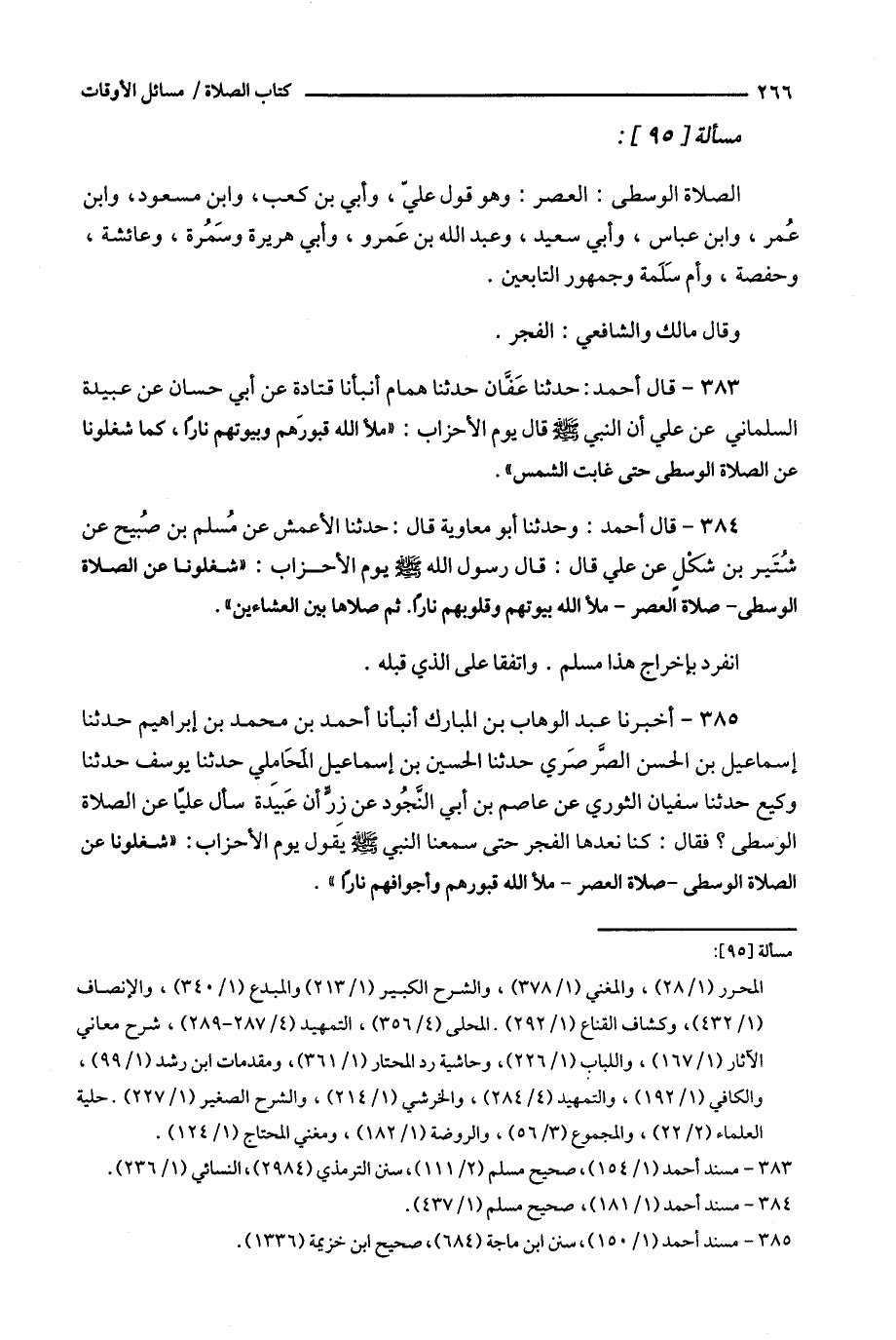 384 - قال أحمد : وحدثنا أبو معاوية قال : حدثنا الأعمش عن مسلم بن صبيح عن شتير بن شكل عن علي قال : قال رسول الله يوم الأحزاب : ' شغلونا عن الصلاة الوسطى - صلاة العصر - ملأ الله بيوتهم وقلوبهم نارا . ثم صلاها بين العشائين ' .