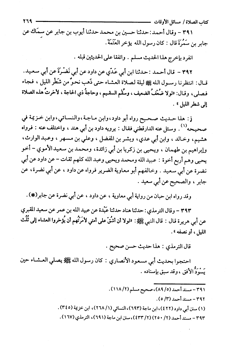 391 - وقال أحمد : حدثنا حسين بن محمد حدثنا أيوب بن جابر عن سماك عن جابر بن سمرة قال : كان رسول الله يؤخر العتمة .