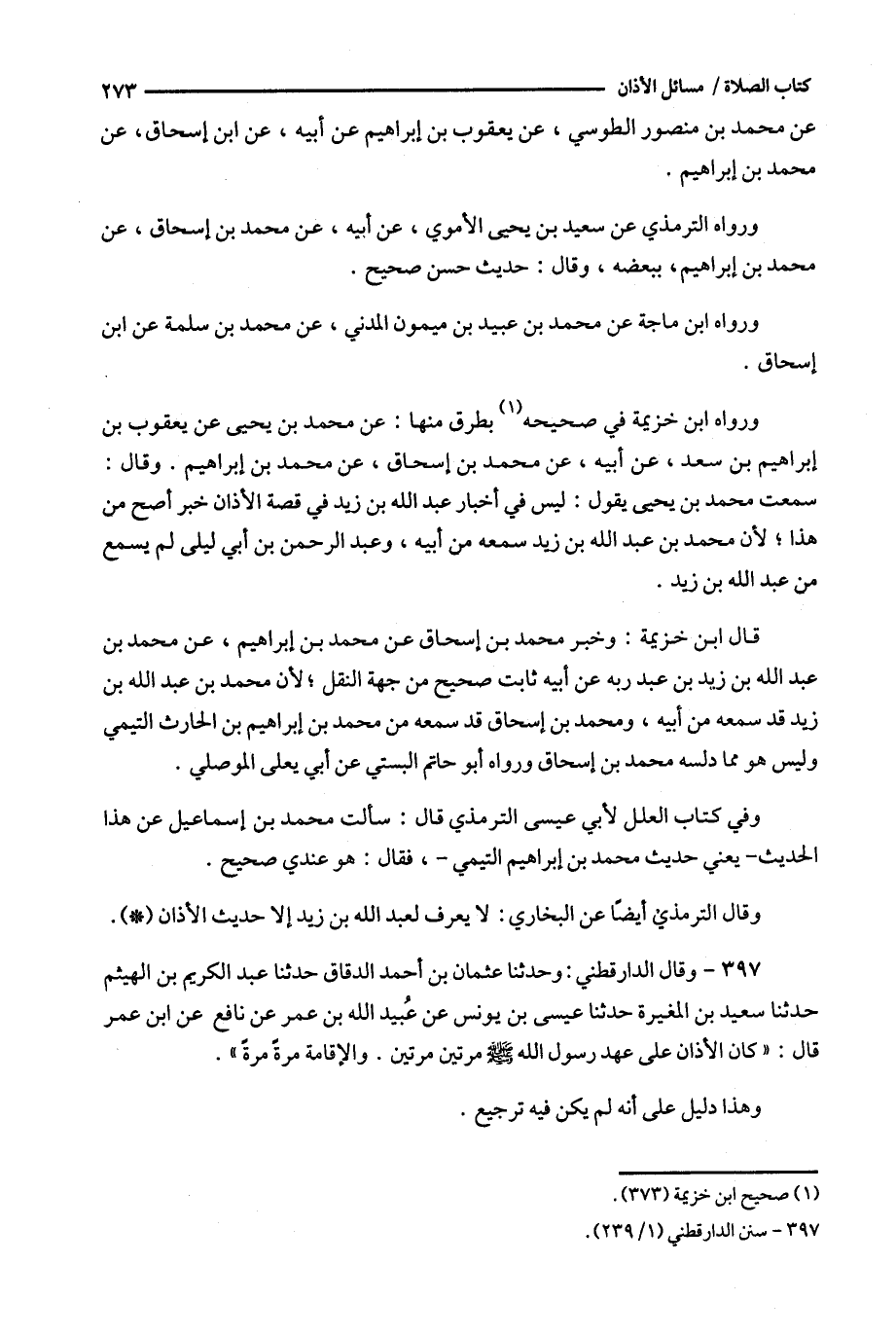ورواه ابن خزيمة في صحيحه ( 1 ) بطرق منها : عن محمد بن يحيى عن يعقوب بن إبراهيم بن سعد ، عن أبيه ، عن محمد بن إسحاق ، عن محمد بن إبراهيم . وقال : سمعت محمد بن يحيى يقول : ليس في أخبار عبد الله بن زيد في قصة الأذان خبر أصح من هذا ؛ لأن محمد بن عبد الله بن زيد سمعه من أبيه ، وعبد الرحمن بن ابي ليلى لم يسمع من عبد الله بن زيد .