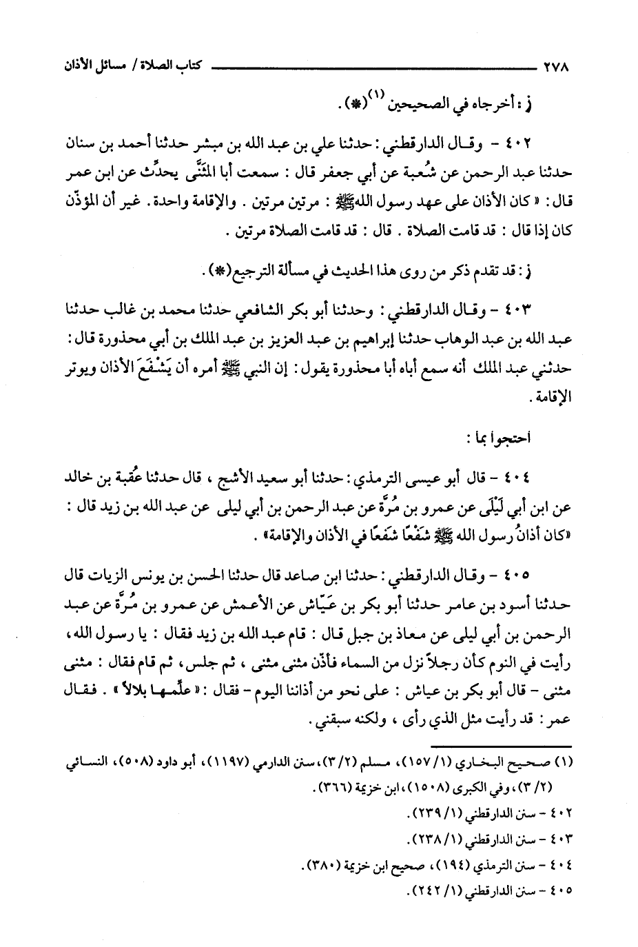 405 - وقال الدارقطني حدثنا ابن صاعد قال حدثنا * 12 الحسن بن يونس الزيات قال حدثنا أسود بن عامر حدثنا أبو بكر بن عياش عن الأعمش عن عمرو بن مرة عن عبد الرحمن بن أبي ليلى عن معاذ بن جبل قال : قام عبد الله بن زيد فقال : يا رسول الله ، رأيت في النوم كأن رجلا نزل من السماء فأذن مثنى مثنى ، ثم جلس ، ثم قام فقال : مثنى مثنى - قال أبو بكر بن عياش : على نحو من أذاننا اليوم - فقال : ' علمها بلالا ' . فقال عمر : قد رأيت مثل الذي رأى ، ولكنه سبقني .