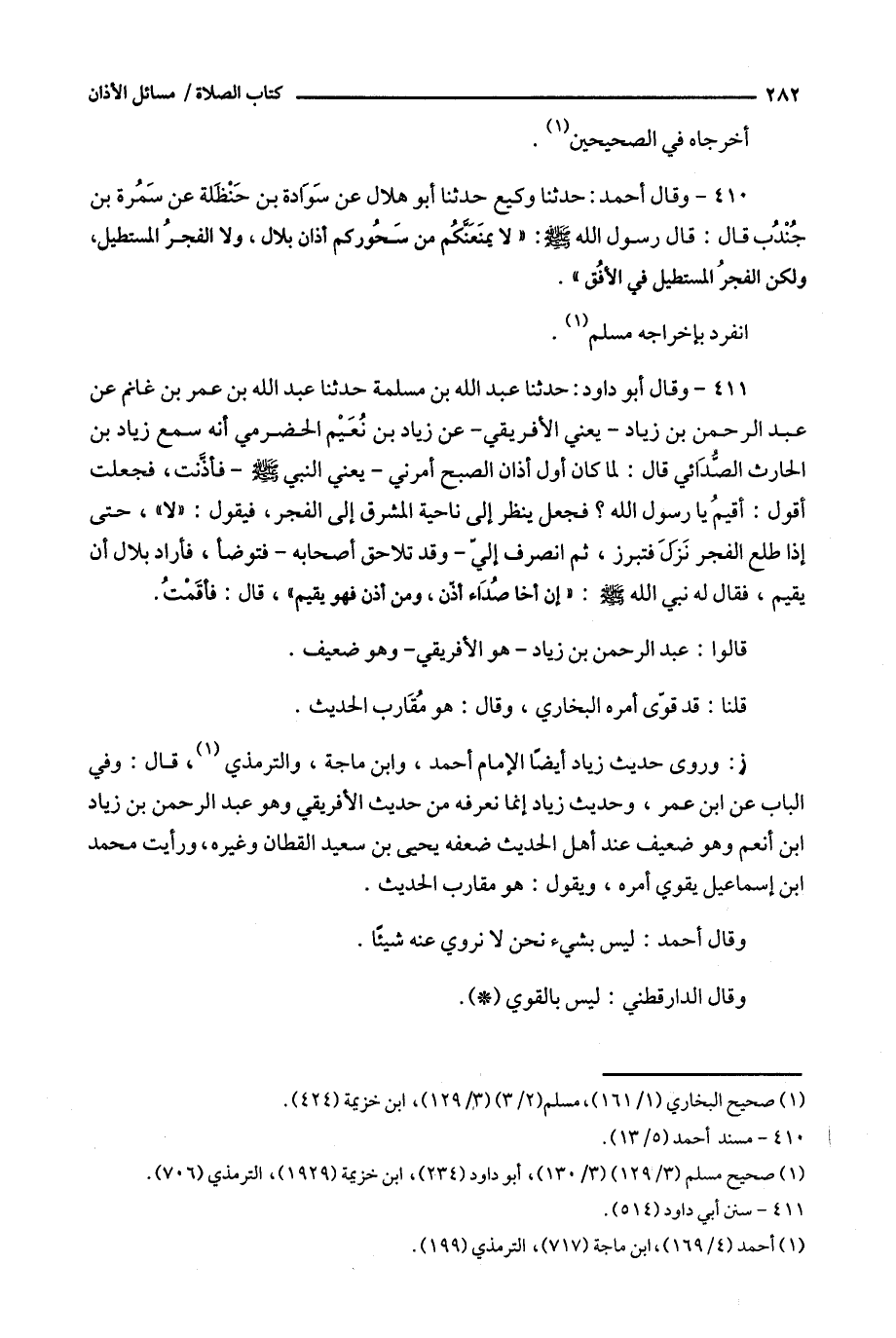 ز : وروى حديث زياد أيضا الإمام أحمد ، وابن ماجة ، والترمذي ( 1 ) ، قال : وفي الباب عن ابن عمر ، وحديث زياد إنما نعرفه من حديث الأفريقي وهو عبد الرحمن بن زياد ابن أنعم وهو ضعيف عند أهل الحديث ضعفه يحيى بن سعيد القطان وغيره ، ورأيت محمد ابن إسماعيل يقوي أمره ، ويقول : هو مقارب الحديث .