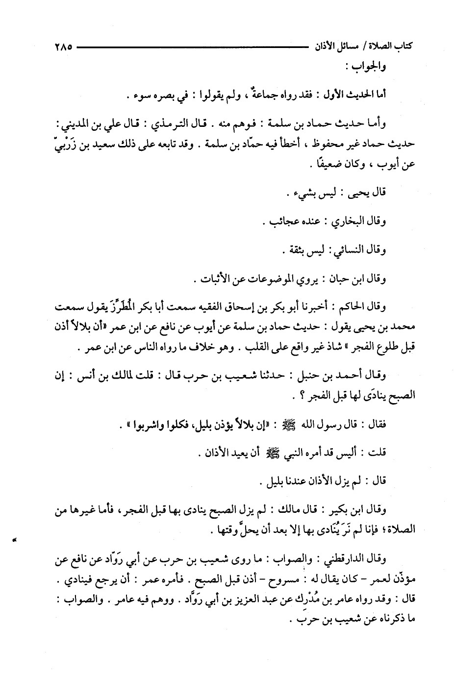 وقال الحاكم : أخبرنا أبو بكر بن إسحاق الفقيه سمعت ابا بكر المطرز يقول سمعت محمد بن يحيى يقول : حديث حماد بن سلمة عن أيوب عن نافع عن ابن عمر ' أن بلالا أذن قبل طلوع الفجر ' شاذ غير واقع على القلب .