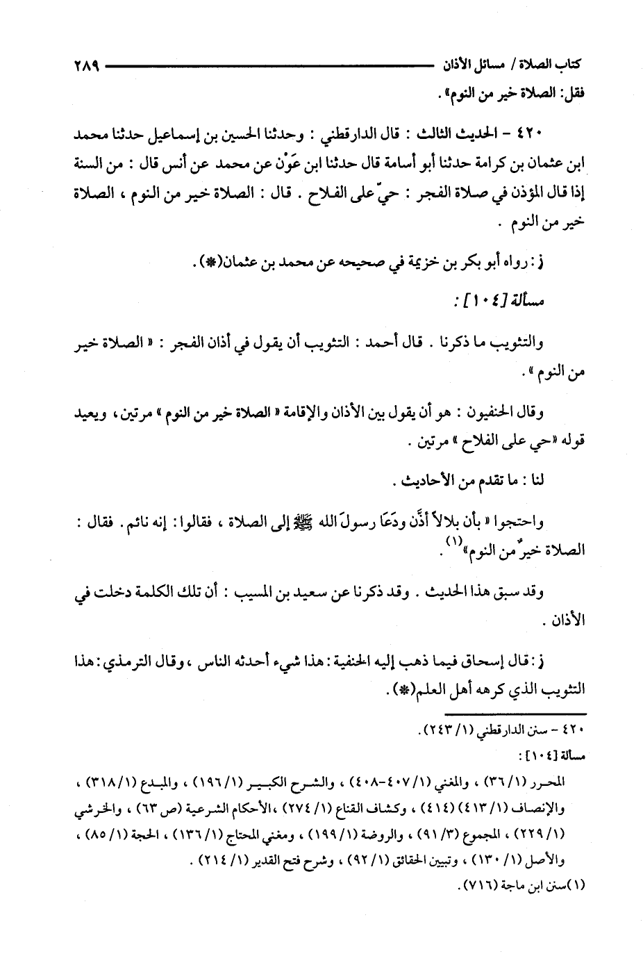 420 - الحديث الثالث : قال الدار قطني : وحدثنا الحسين بن إسماعيل حدثنا محمد ابن عثمان بن كرامة حدثنا أبو أسامة قال حدثنا ابن عون عن محمد عن أنس قال : من السنة إذا قال المؤذن في صلاة الفجر : حي على الفلاح .