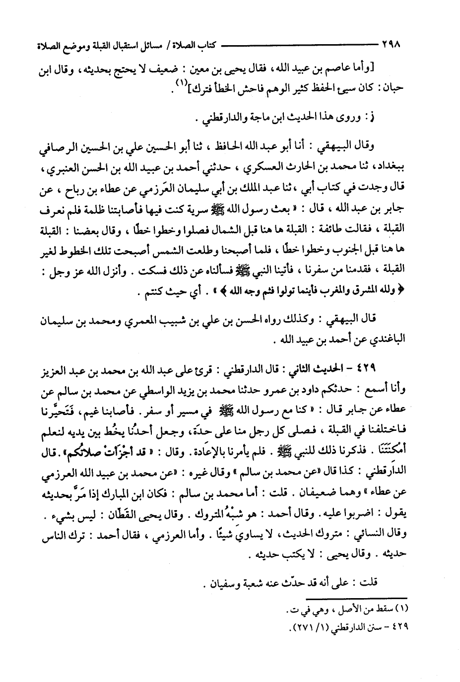 429 - الحديث الثاني : قال الدارقطني قرئ على عبد الله بن محمد بن عبد العزيز وأنا أسمع : حدثكم داود بن عمرو حدثنا محمد بن يزيد الواسطي عن محمد بن سالم عن عطاء عن جابر قال : ' كنا مع رسول الله في مسير أو سفر .