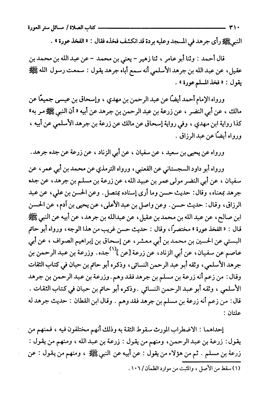 النبي رأى جرهد في المسجد وعليه بردة قد انكشف فخذه فقال : ' الفخذ عورة ' .
