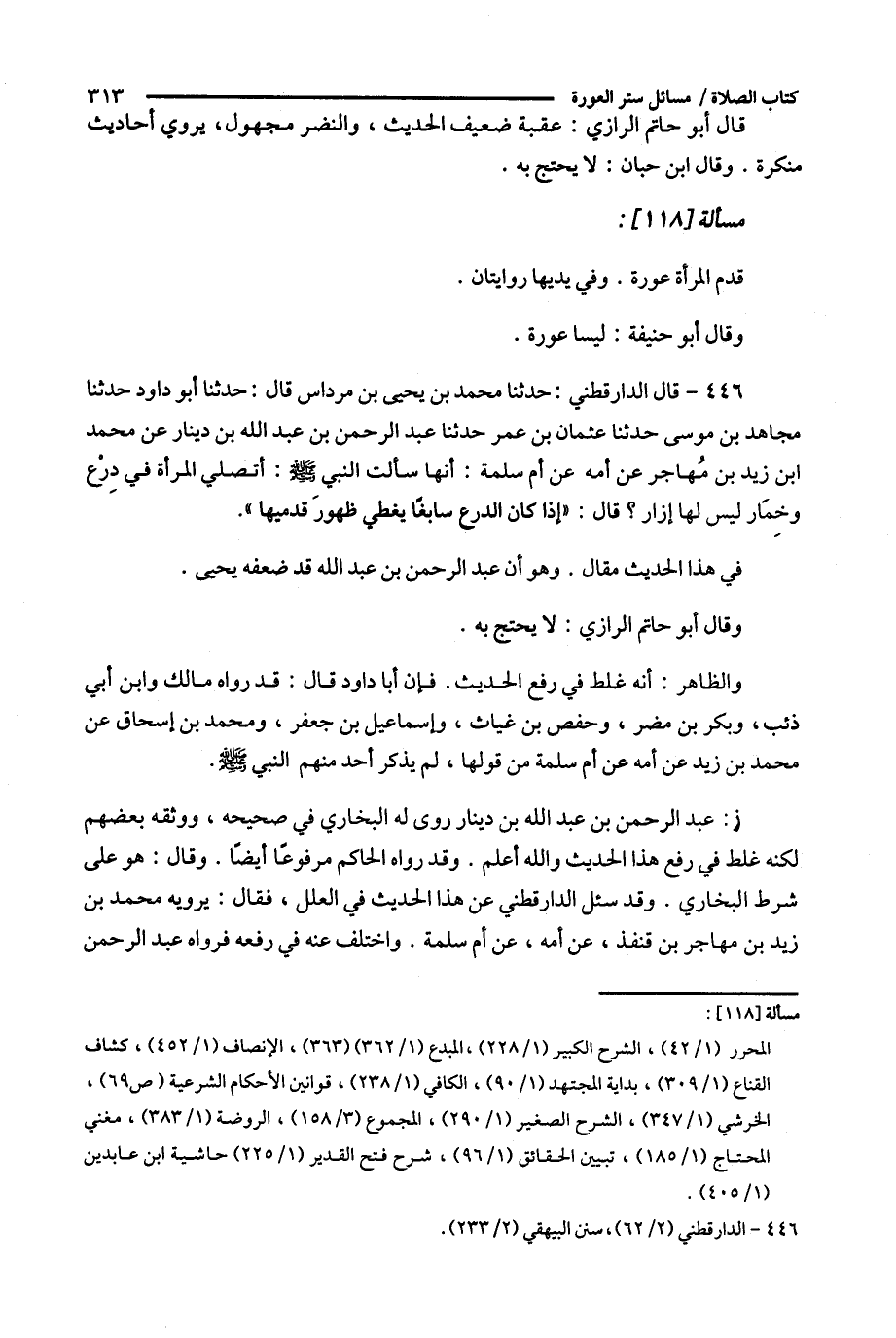 446 - قال الدارقطني : حدثنا محمد بن يحيى بن مرداس قال : حدثنا أبو داود حدثنا مجاهد بن موسى حدثنا عثمان بن عمر حدثنا عبد الرحمن بن عبد الله بن دنيار عن محمد ابن زيد بن مهاجر عن أمه عن أم سلمة : أنها سألت النبي : أتصلي المرأة في درع وخمار ليس لها إزار ؟ قال : ' إذا كان الدرع سابغا يغطي ظهور قدميها ' .