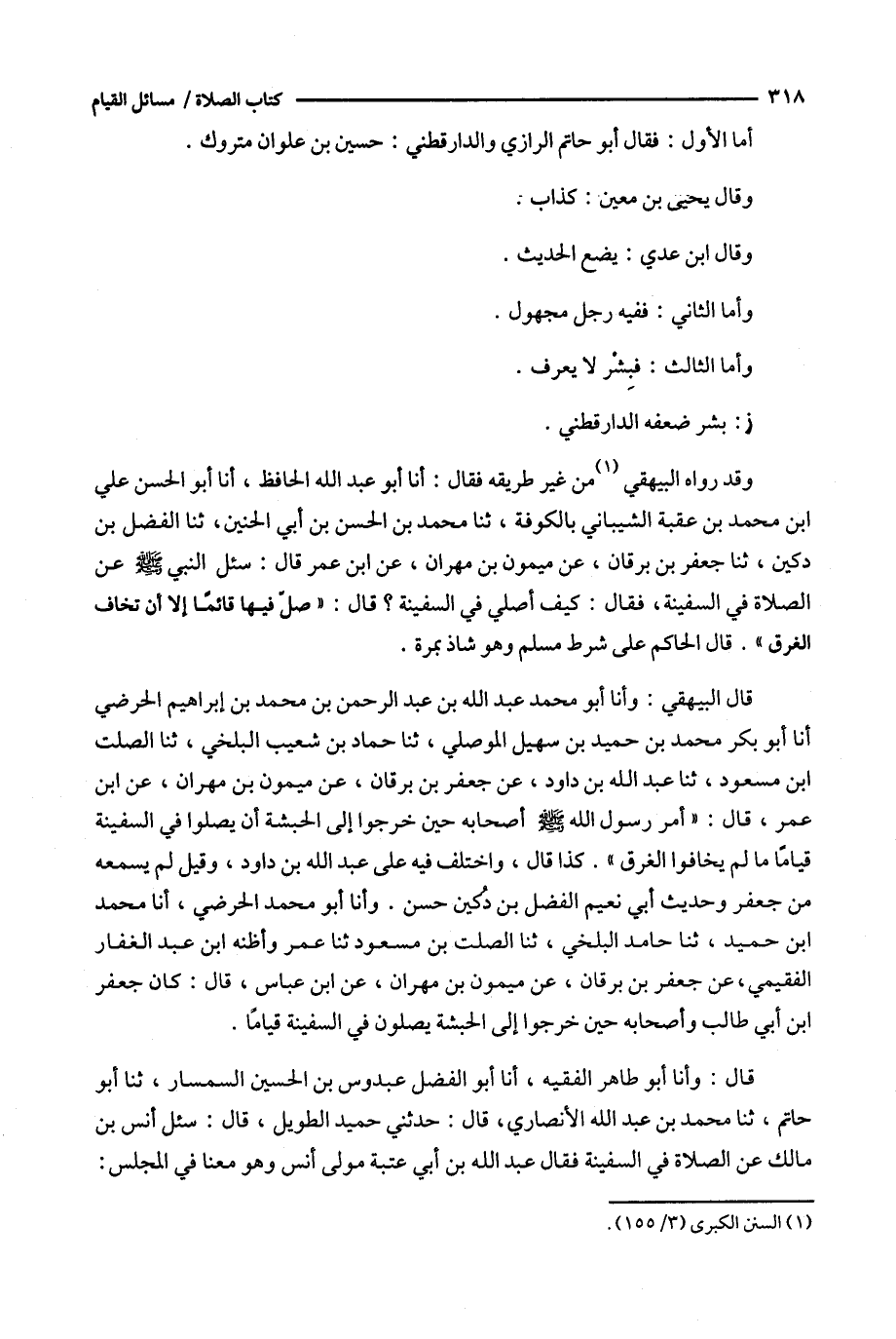 قال البيهقي : وأنا أبو محمد عبد الله بن عبد الرحمن بن محمد بن إبراهيم الحرضي أنا أبو بكر محمد بن حميد بن سهيل الموصلي ، ثنا حماد بن شعيب البلخي ، ثنا الصلت ابن مسعود ، ثنا عبد الله بن داود ، عن جعفر بن برقان ، عن ميمون بن مهران ، عن ابن عمر ، قال : ' أمر رسول الله أصحابه حين خرجوا إلى الحبشة أن يصلوا في السفينة قياما ما لم يخافوا الغرق ' .