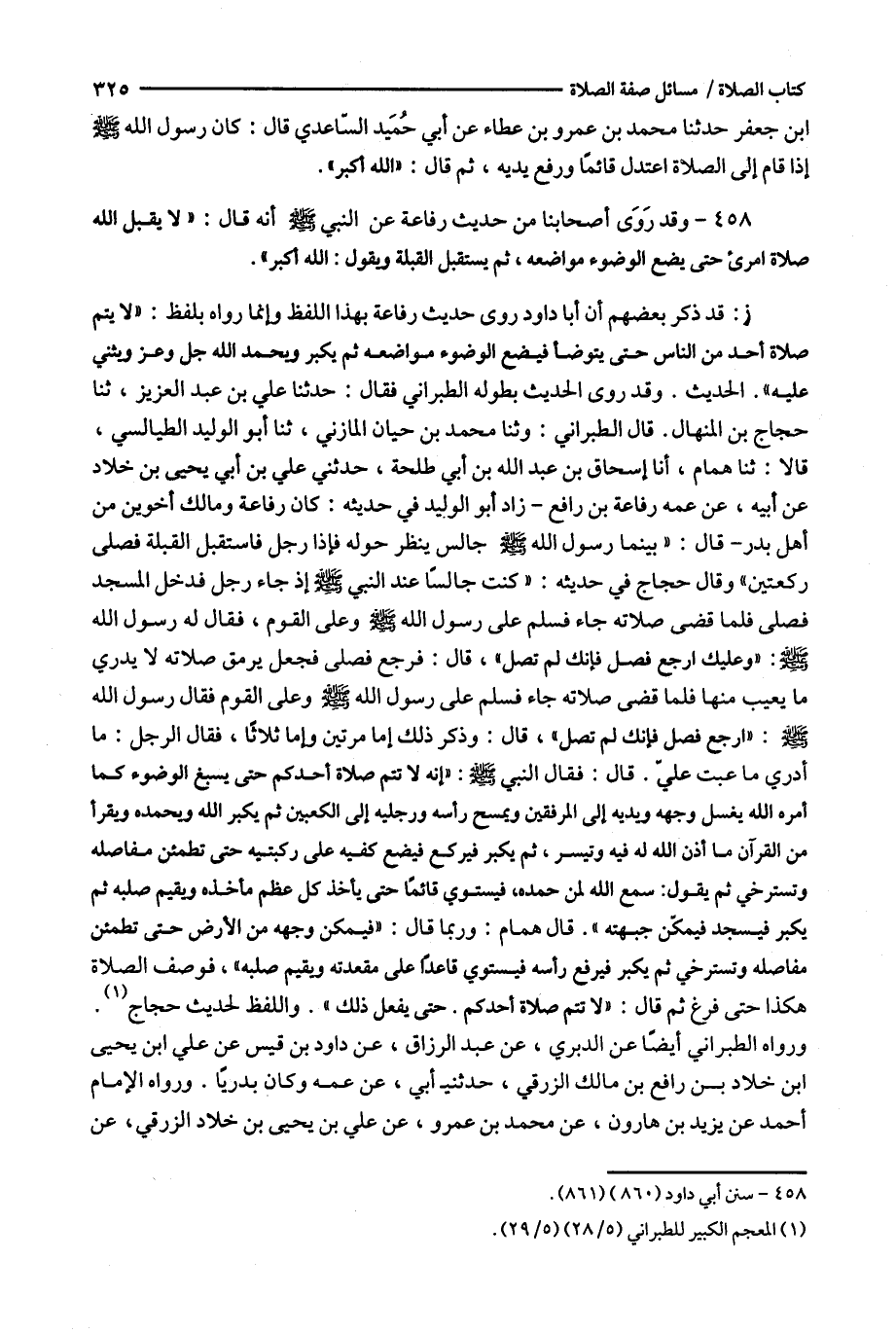 458 - وقد روى أصحابنا من حديث رفاعة عن النبي أنه قال : ( ( لا يقبل الله صلاة امرئ حتى يضع الوضوء مواضعه ، ثم يستقبل القبلة ويقول : الله أكبر ) ) .