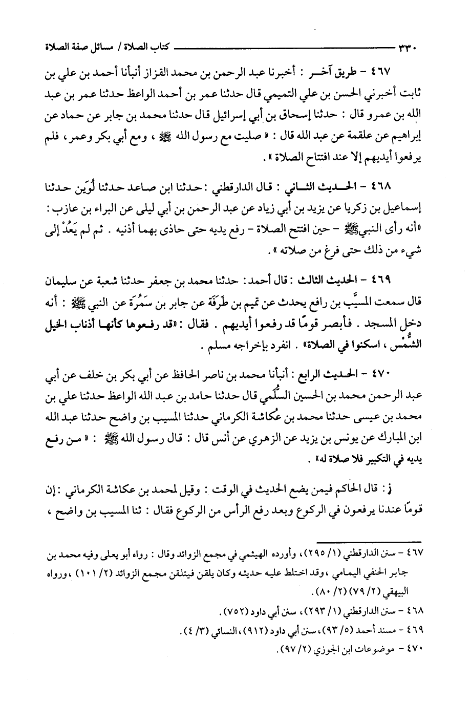467 - طريق آخر : أخبرنا عبد الرحمن بن محمد القزاز أنبأنا أحمد بن علي بن ثابت أخبرني الحسن بن علي التميمي قال حدثنا عمر بن أحمد الواعظ حدثنا عمر بن عبد الله بن عمرو قال : حدثنا إسحاق بن أبي إسرائيل قال حدثنا محمد بن جابر عن حماد عن إبراهيم عن علقمة عن عبد الله قال : ' صليت مع رسول الله ، ومع أبي بكر وعمر ، فلم يرفعوا أيديهم إلا عند افتتاح الصلاة ' .