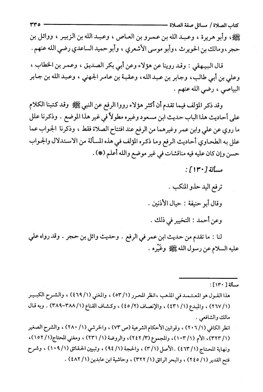 وذكرنا علل ما روي عن علي وابن عمر وغيرهما من الرفع عند افتتاح الصلاة فقط ، وذكرنا الجواب عما علل به الطحاوي أحاديث الرفع وما ذكره المؤلف في هذه المسألة من الاستدلال والجواب حسن وإن كان عليه فيه مناقشات في غير موضع والله أعلم ( * ) .