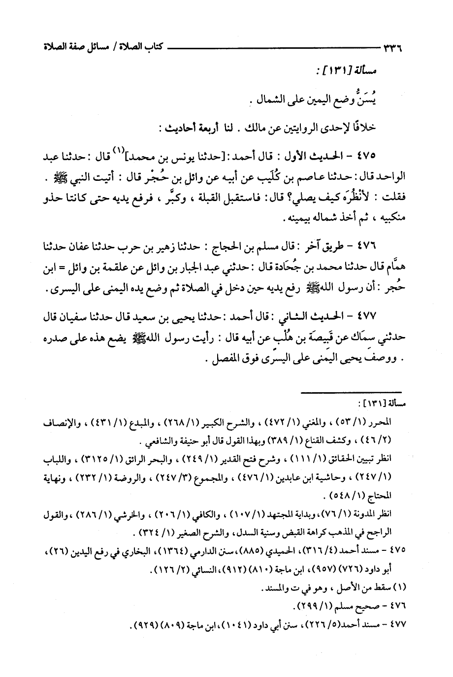477 - الحديث الثاني : قال أحمد : حدثنا يحيى بن سعيد قال حدثنا سفيان قال حدثني سماك عن قبيصة بن هلب عن أبيه قال : رأيت رسول الله يضع هذه على صدره .