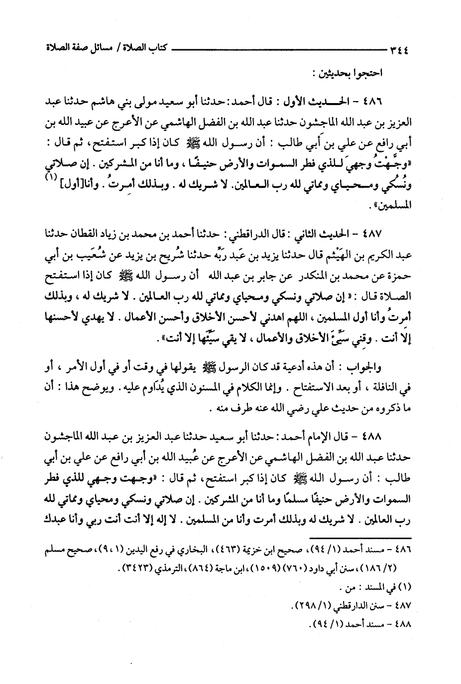 488 - قال الإمام أحمد : حدثنا أبو سعيد حدثنا عبد العزيز بن عبد الله الماجشون حدثنا عبد الله بن الفضل الهاشمي عن الأعرج عن عبيد الله بن أبي رافع عن علي بن أبي طالب : أن رسول الله كان إذا كبر استفتح ، ثم قال : ( ( وجهت وجهي للذي فطر السموات والأرض حنيفا مسلما وما أنا من المشركين .