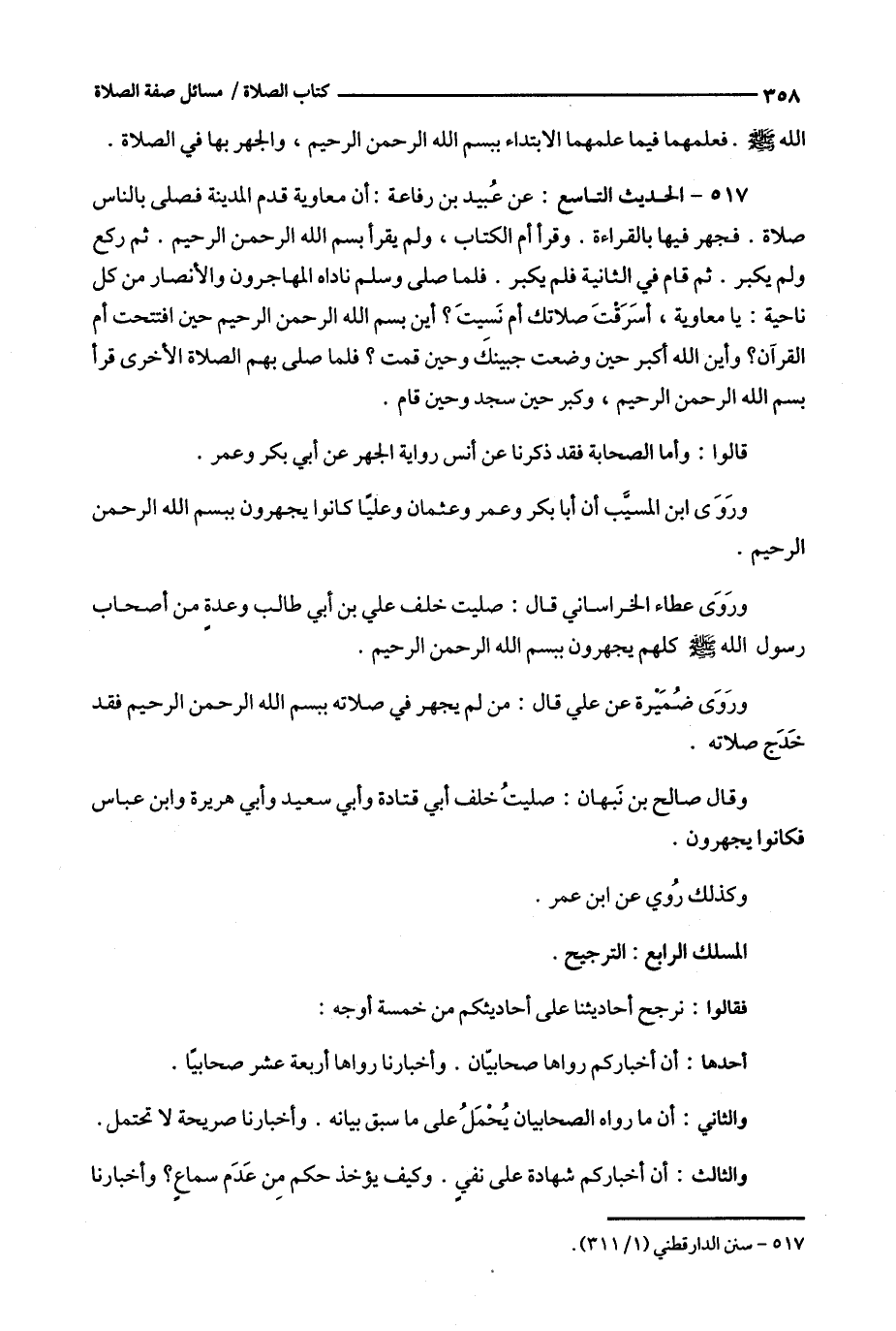 517 - الحديث التاسع : عن عبيد بن رفاعة : أن معاوية قدم المدينة فصلى بالناس صلاة . فجهر فيها بالقراءة . وقرأ أم الكتاب ، ولم يقرأ بسم الله الرحمن الرحيم . ثم ركع ولم يكبر . ثم قام في الثانية فلم يكبر . فلما صلى وسلم ناداه المهاجرون والأنصار من كل ناحية : يا معاوية ، أسرقت صلاتك أم نسيت ؟ أين بسم الله الرحمن الرحيم حين افتتحت أم القرآن . وأين الله أكبر حين وضعت جبينك وحين قمت ؟ فلما صلى بهم الصلاة الأخرى قرأ بسم الله الرحمن الرحيم ، وكبر حين سجد وحين قام .