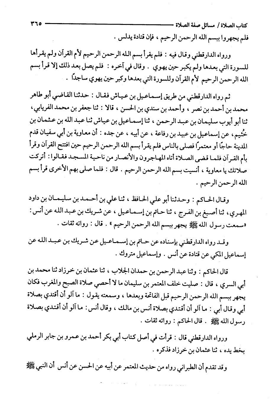 قال الحاكم : وثنا عبد الرحمن بن حمدان الجلاب ، ثنا عثمان بن خرزاد ثنا محمد بن أبي السري ، قال : صليت خلف المعتمر بن سليمان ما لا أحصي صلاة الصبح والمغرب فكان يجهر ببسم الله الرحمن الرحيم قبل الفاتحة وبعدها ، وسمعته يقول : ما آلو أن أقتدي بصلاة أبي وقال أبي : ما آلو أن أقتدي بصلاة أنس بن مالك ، وقال أنس : ما آلو أن أقتدي بصلاة رسول الله . قال الحاكم رواته ثقات .