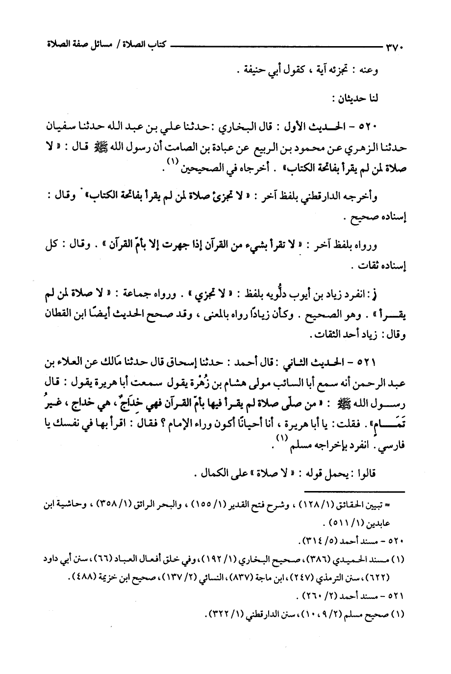 520 - الحديث الأول : قال البخاري : حدثنا علي بن عبد الله حدثنا سفيان حدثنا الزهري عن محمود بن الربيع عن عبادة بن الصامت أن رسول الله قال : ( ( لا صلاة لمن لم يقرأ بفاتحة الكتاب ) ) . أخرجاه في الصحيحين ( 1 ) .