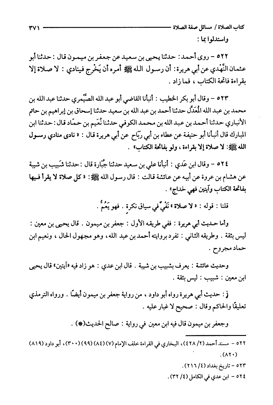 522 - روى أحمد : حدثنا يحيى بن سعيد عن جعفر بن ميمون قال : حدثنا أبو عثمان النهدي عن أبي هريرة : أن رسول الله أمره أن يخرج فينادي : لا صلاة إلا بقراءة فاتحة الكتاب ، فما زاد .