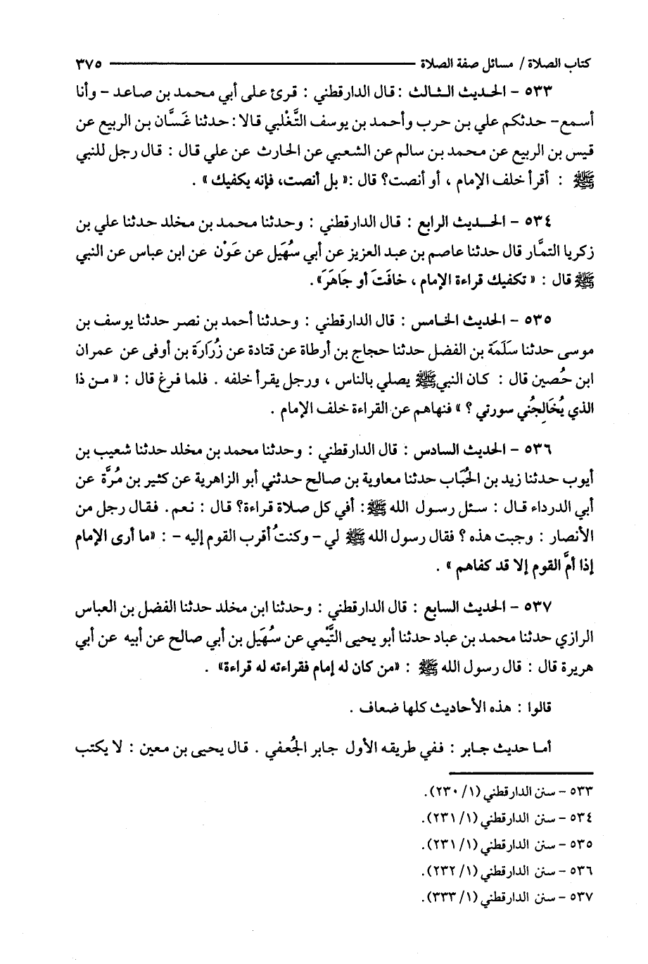 535 - الحديث الخامس : قال الدار قطني : وحدثنا أحمد بن نصر حدثنا يوسف بن موسى حدثنا سلمة بن الفضل حدثنا حجاج بن أرطاة عن قتادة عن زرارة بن أوفى عن عمران ابن حصين قال : كان النبي يصلي بالناس ، ورجل يقرأ خلفه . فلما فرغ قال : ( ( من ذا الذي يخالجني سورتي ؟ ) ) فنهاهم عن القراءة خلف الإمام .
