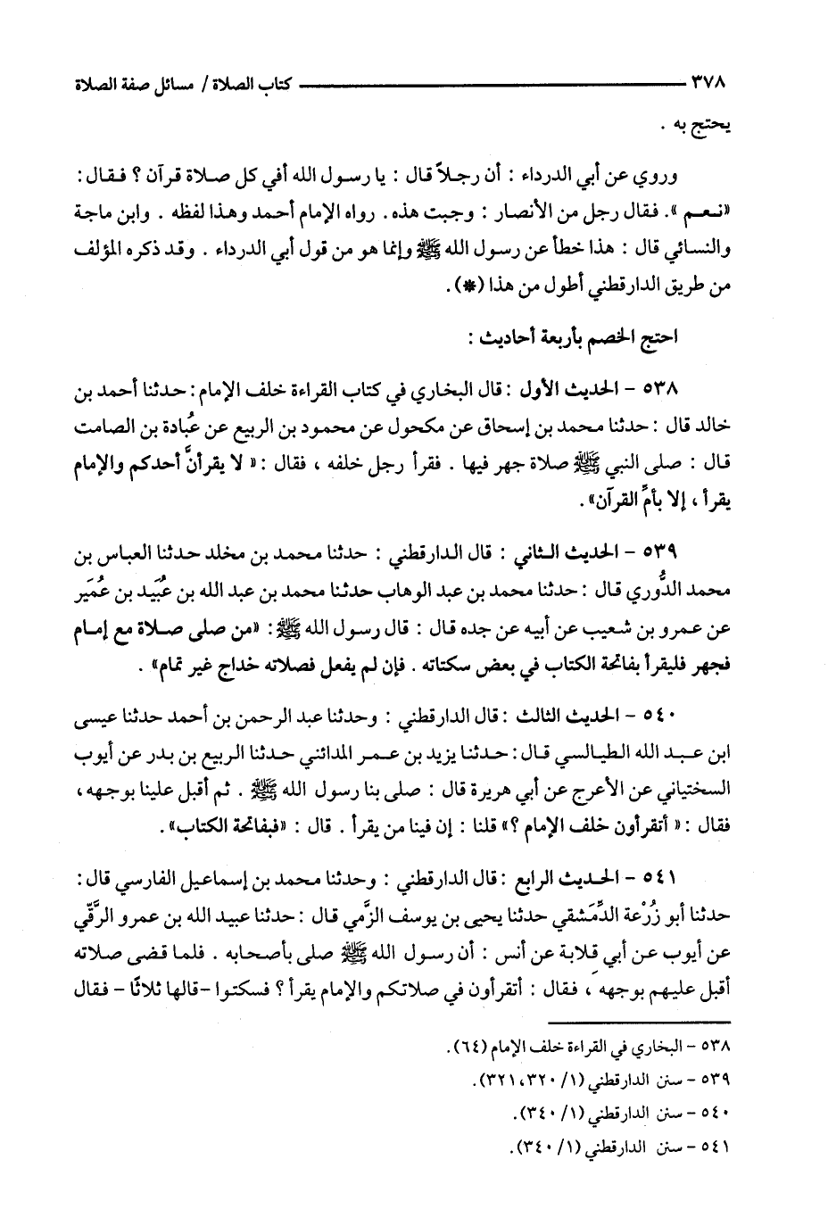 541 - الحديث الرابع : قال الدارقطني : وحدثنا محمد بن إسماعيل الفارسي قال : حدثنا أبو زرعة الدمشقي حدثنا يحيى بن يوسف الزمي قال : حدثنا عبيد الله بن عمرو الرقي عن ايوب عن أبي قلابة عن أنس : أن رسول الله صلى بأصحابه . فلما قضى صلاته أقبل عليهم بوجهه ، فقال : أتقرأون في صلاتكم والإمام يقرأ ؟ فسكتوا - قالها ثلاثا - فقال